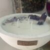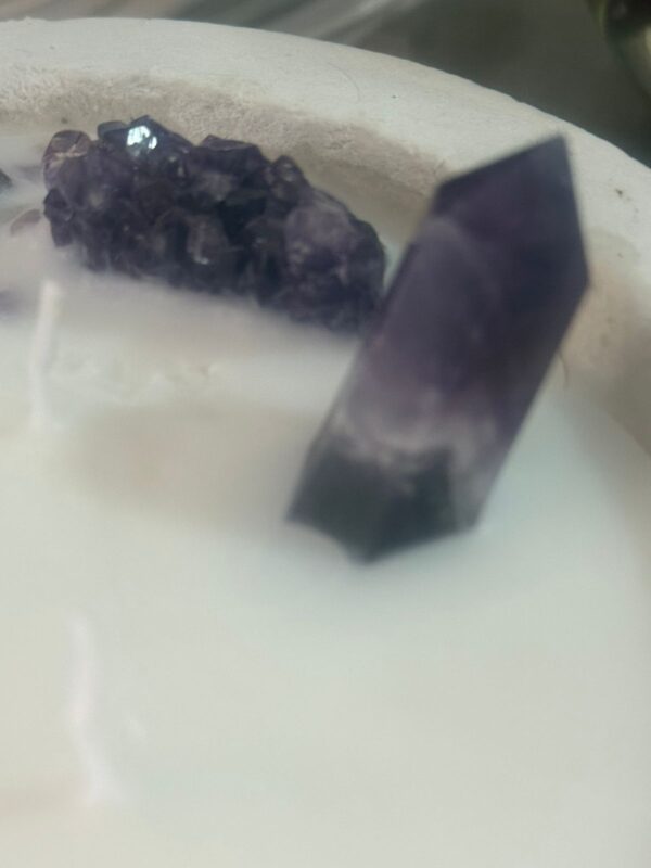 Velón en pieza única hecha a mano, base cemento blanco con piedras amatista, 1 punta de amatista, 1 geoda de cuarzo amatista, diseño deco_vaikoa